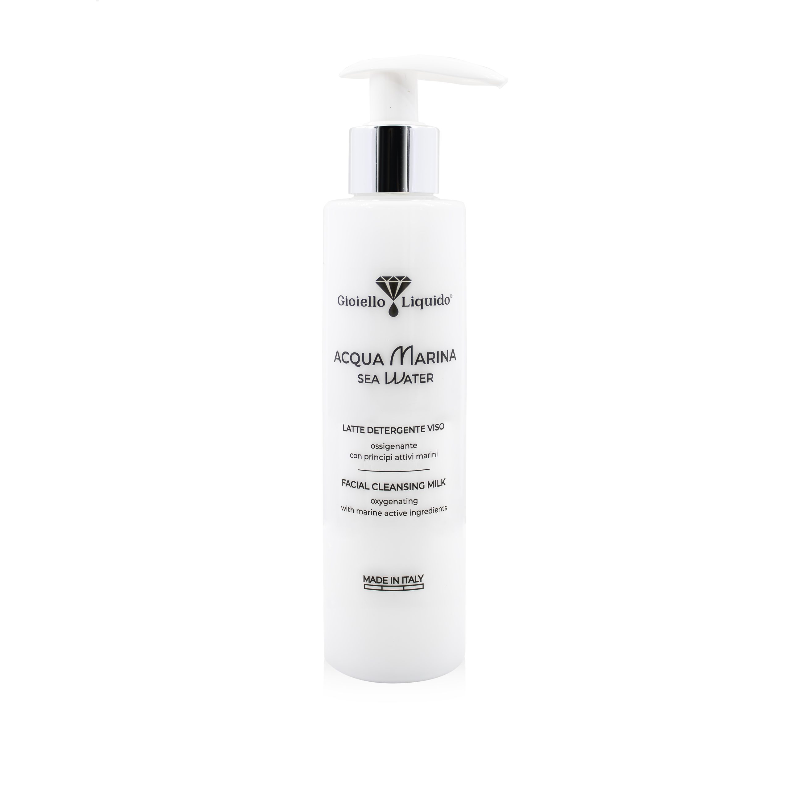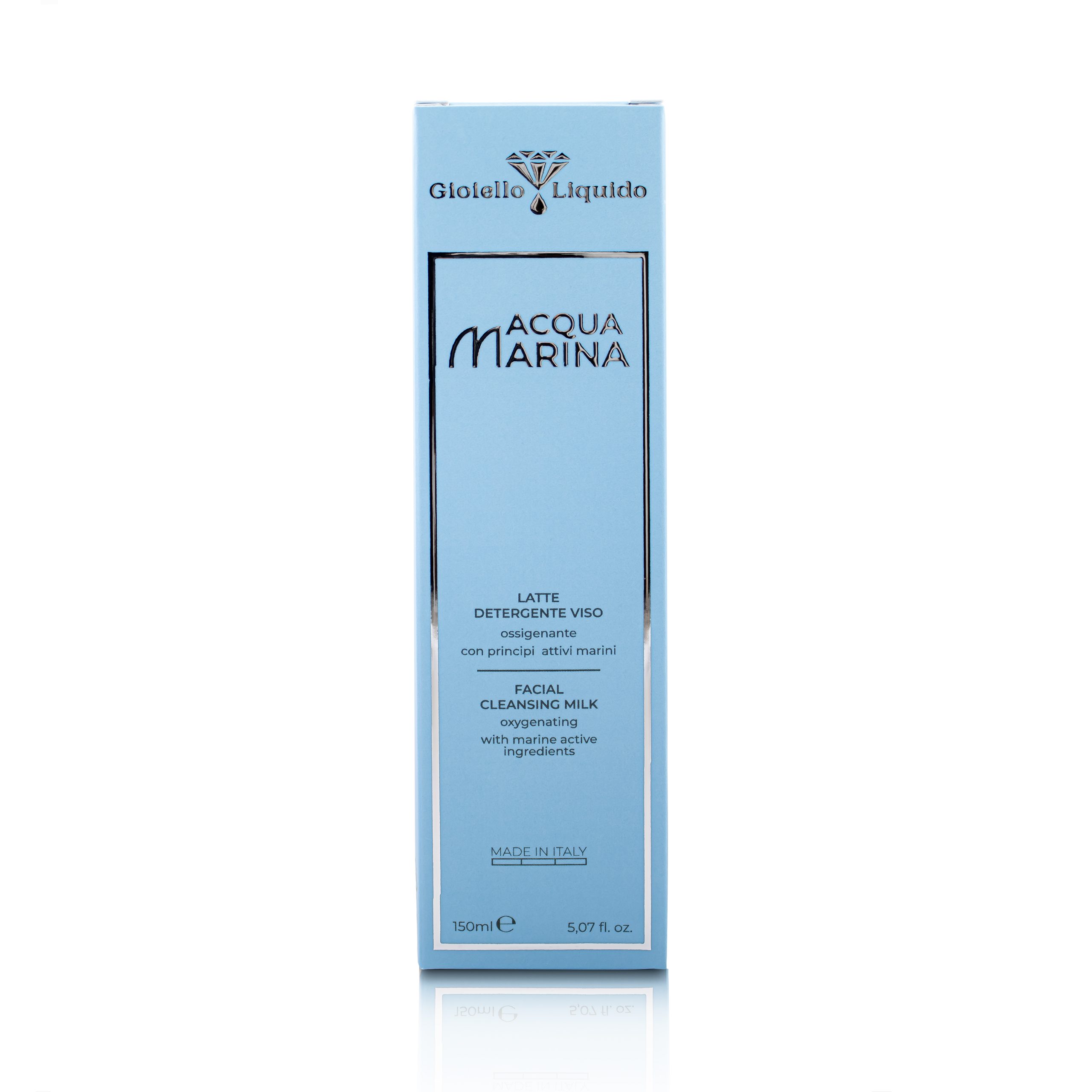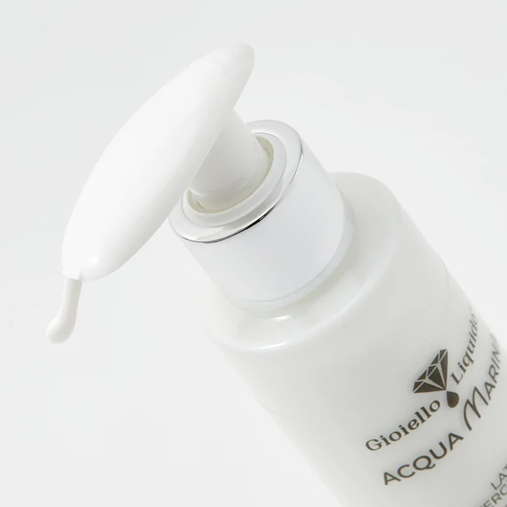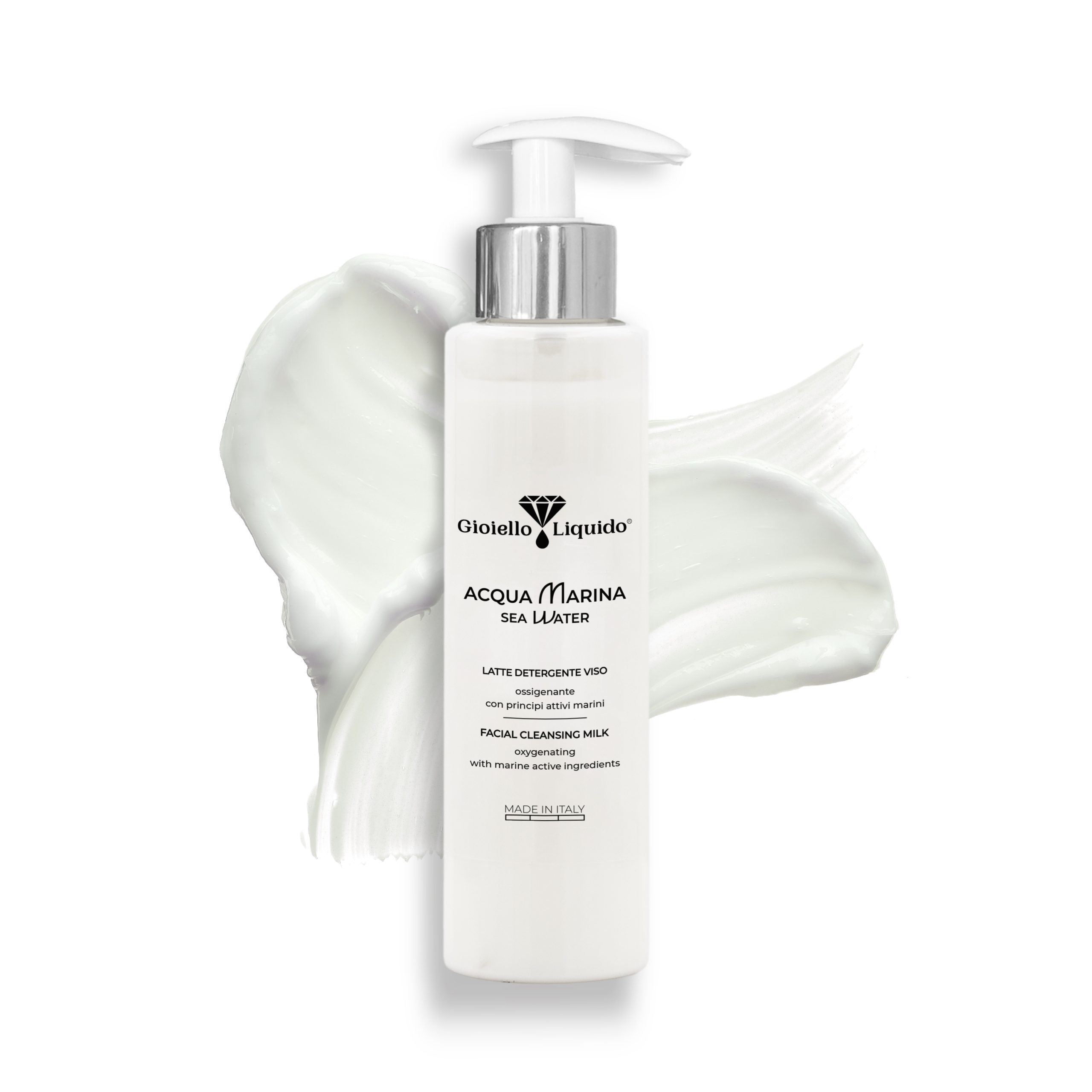 Experience an extraordinary cleansing and nourishing ritual with the Acqua Marina Facial Cleansing Milk by Gioiello Liquido®. Enjoy a journey through ocean waves and the delicate care of your skin. The Hyaluronic Acid in the formula is known for its ability to retain water, providing deep and lasting hydration, helping to improve skin elasticity. The formula also includes Macroalgae Kappaphycus Alvarezii, rich in essential marine nutrients, which helps purify the skin by gently removing impurities, while delivering a rich dose of minerals that enhance the skin’s overall appearance. Sodium PCA, naturally derived from beetroot, is a powerful humectant that helps restore the skin, leaving it fresh, radiant, and ready to receive further benefits from your beauty routine.
